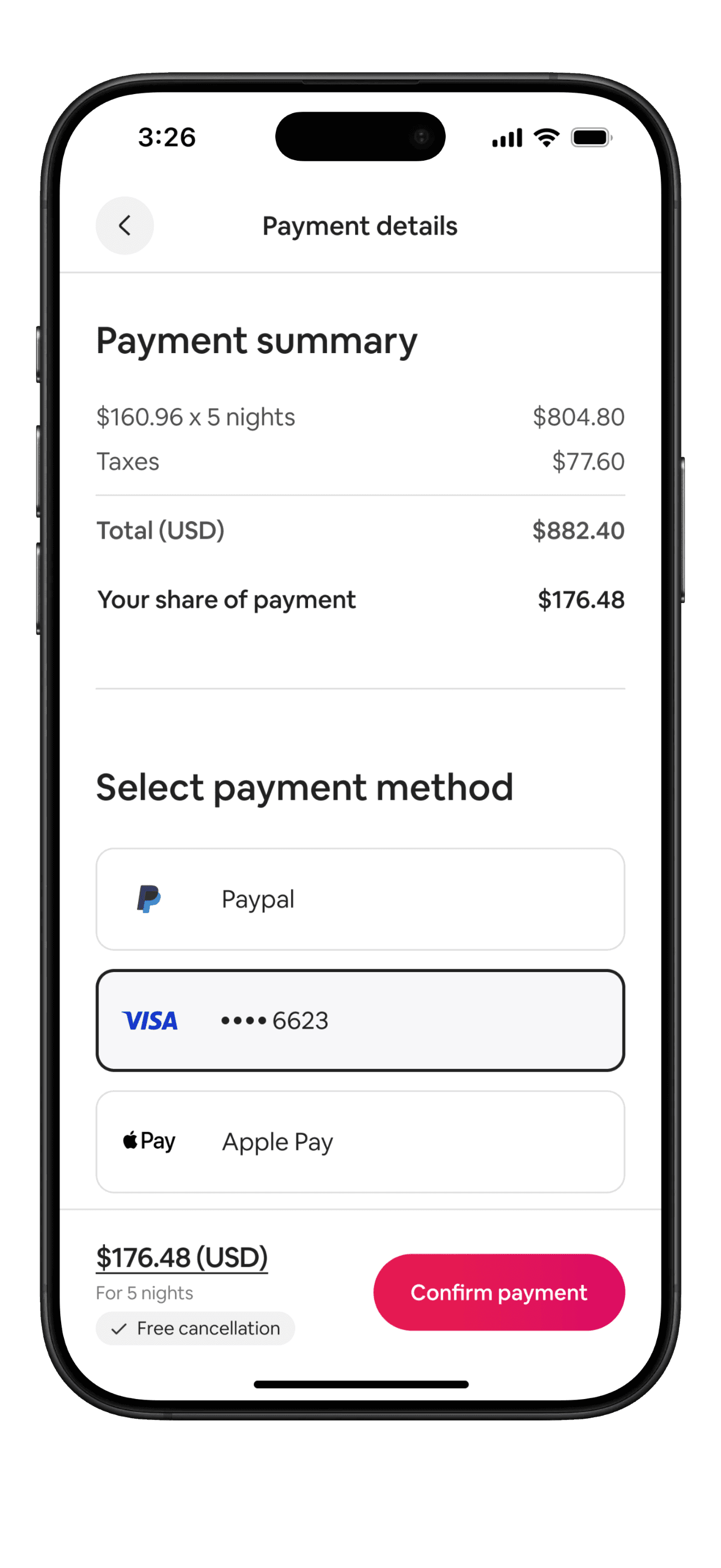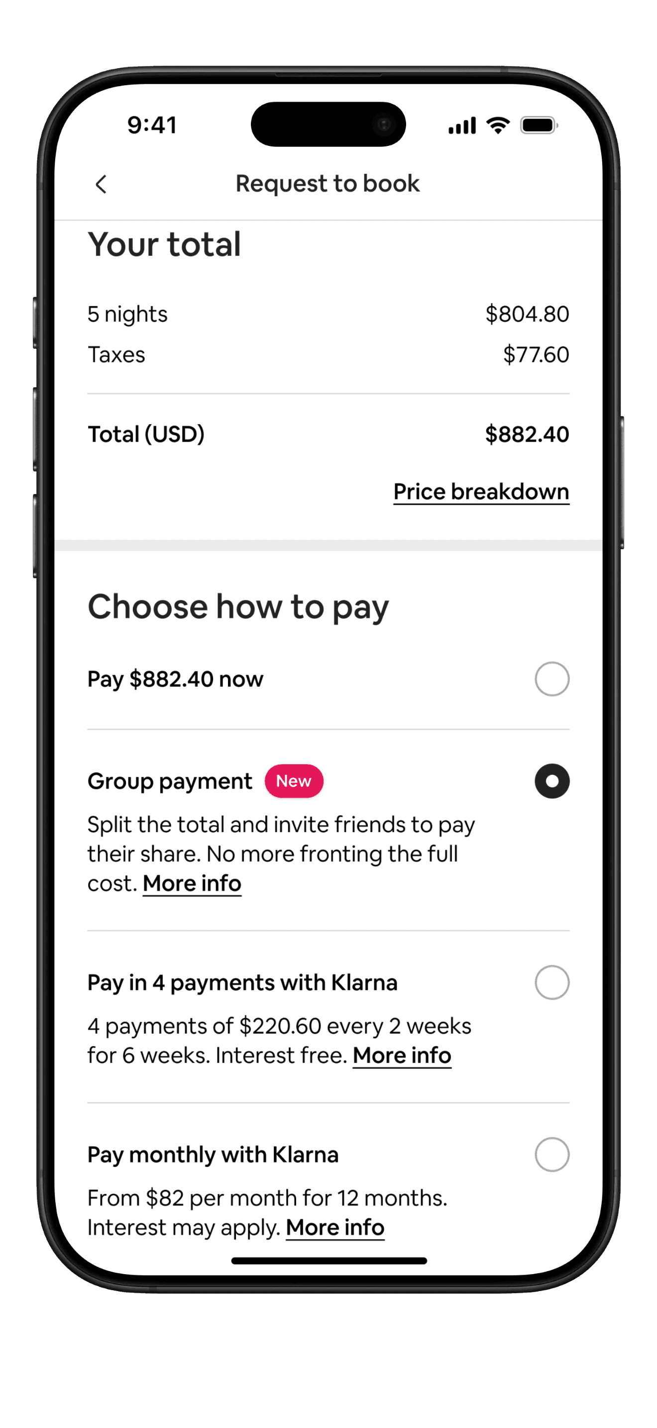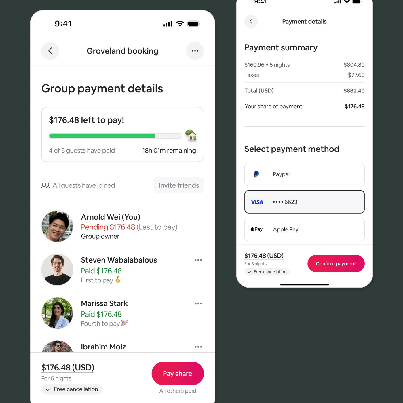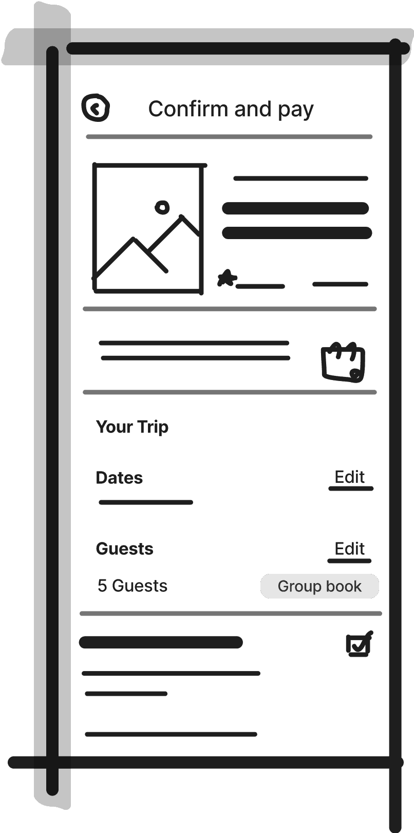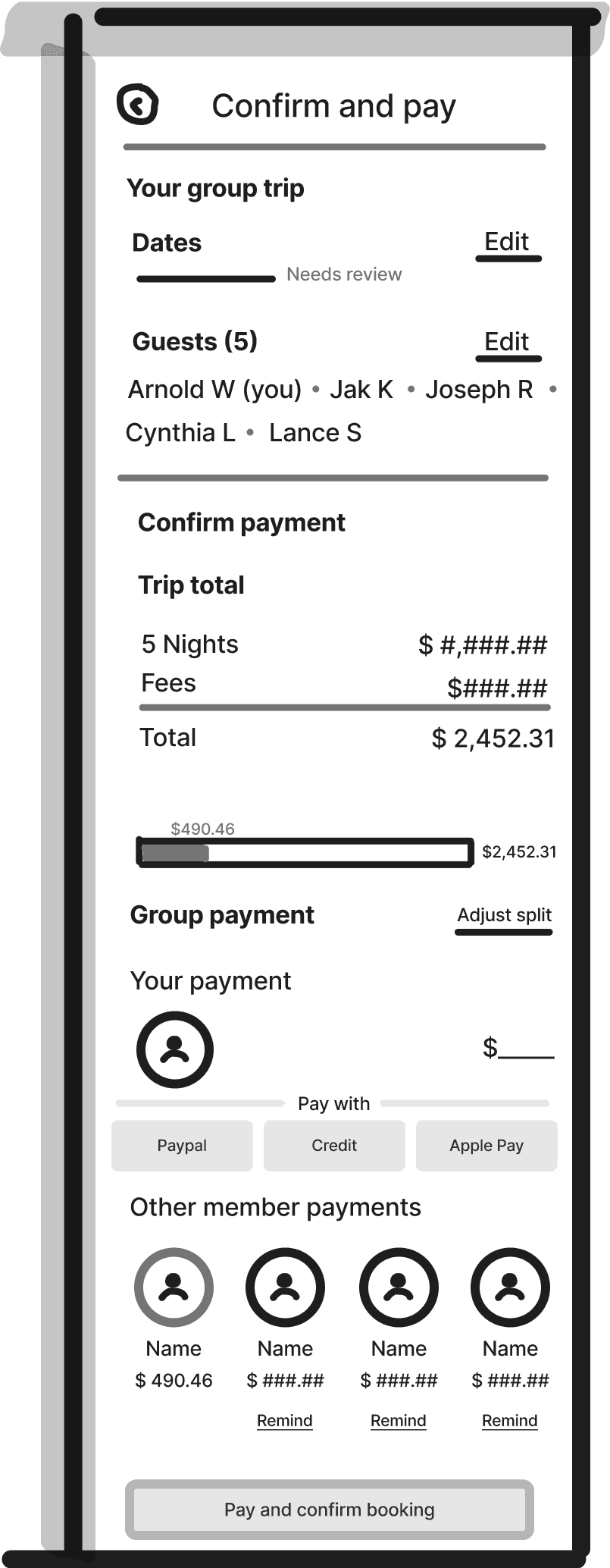 We internalized our initial user feedback and designed a dashboard page where users could manage their group payment. To begin a group payment, users can select the option nestled seamlessly withinAirbnb's existing checkout flow, which triggers a booking hold.