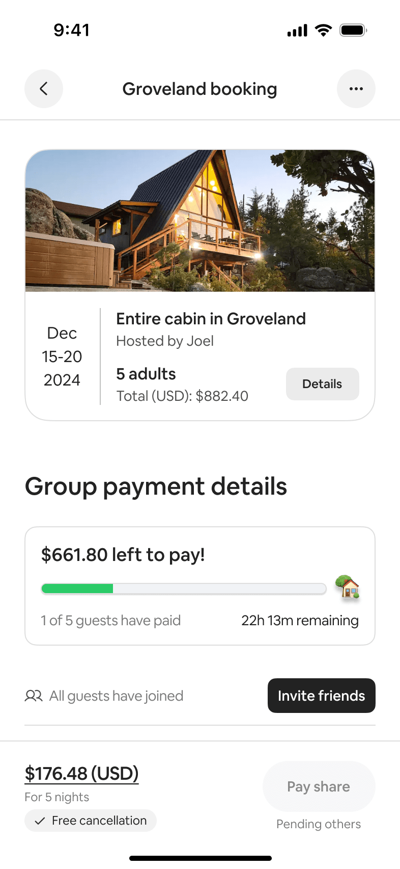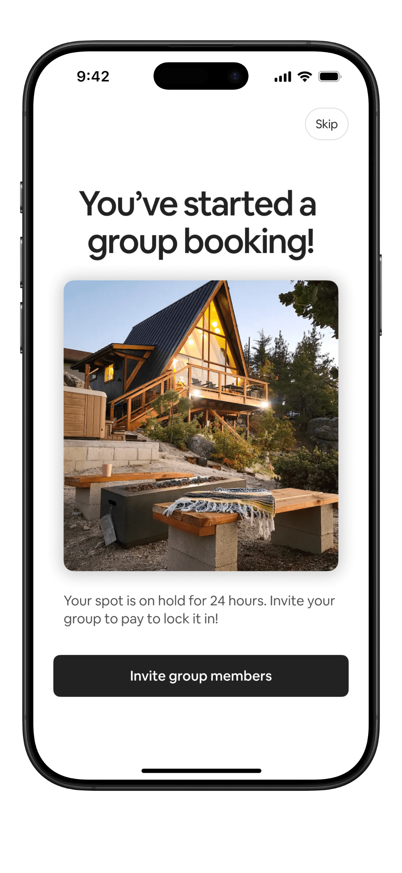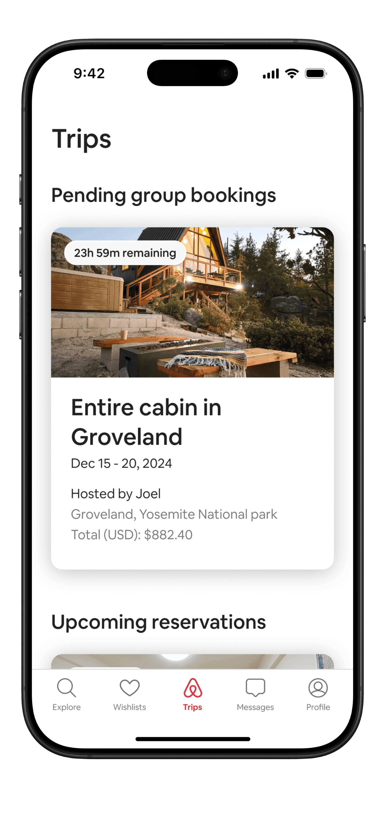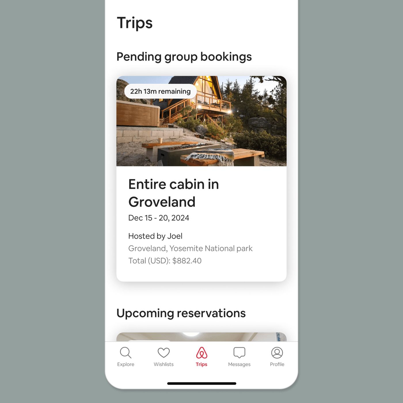Pending group bookings will sit as the first item within the Trips tab, allowing for easy access for the group owner, as well as seamless integration with Airbnb's existing design architecture.