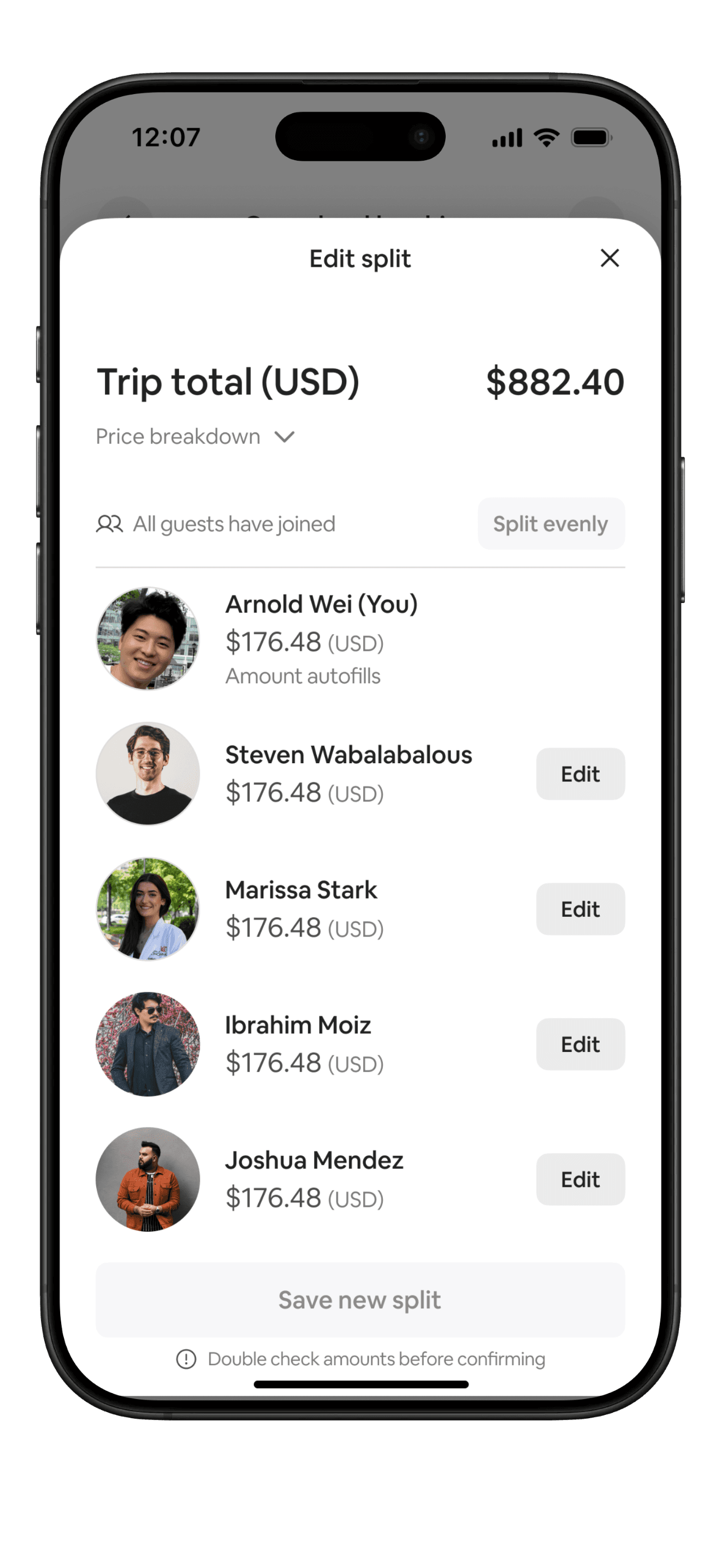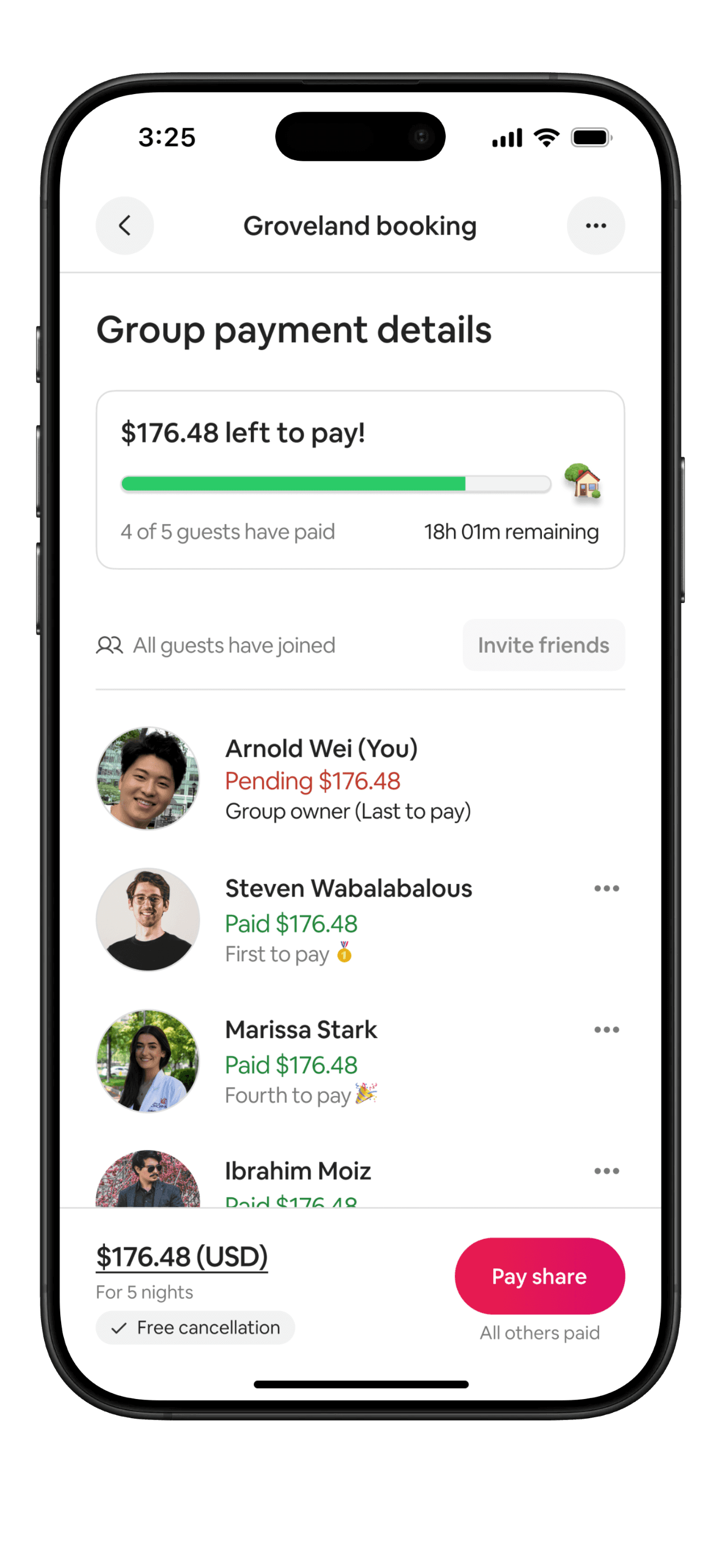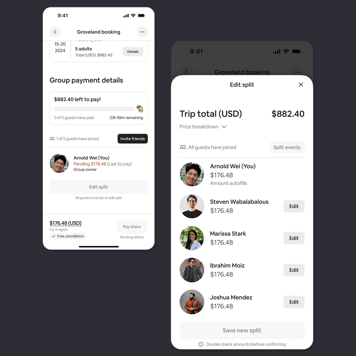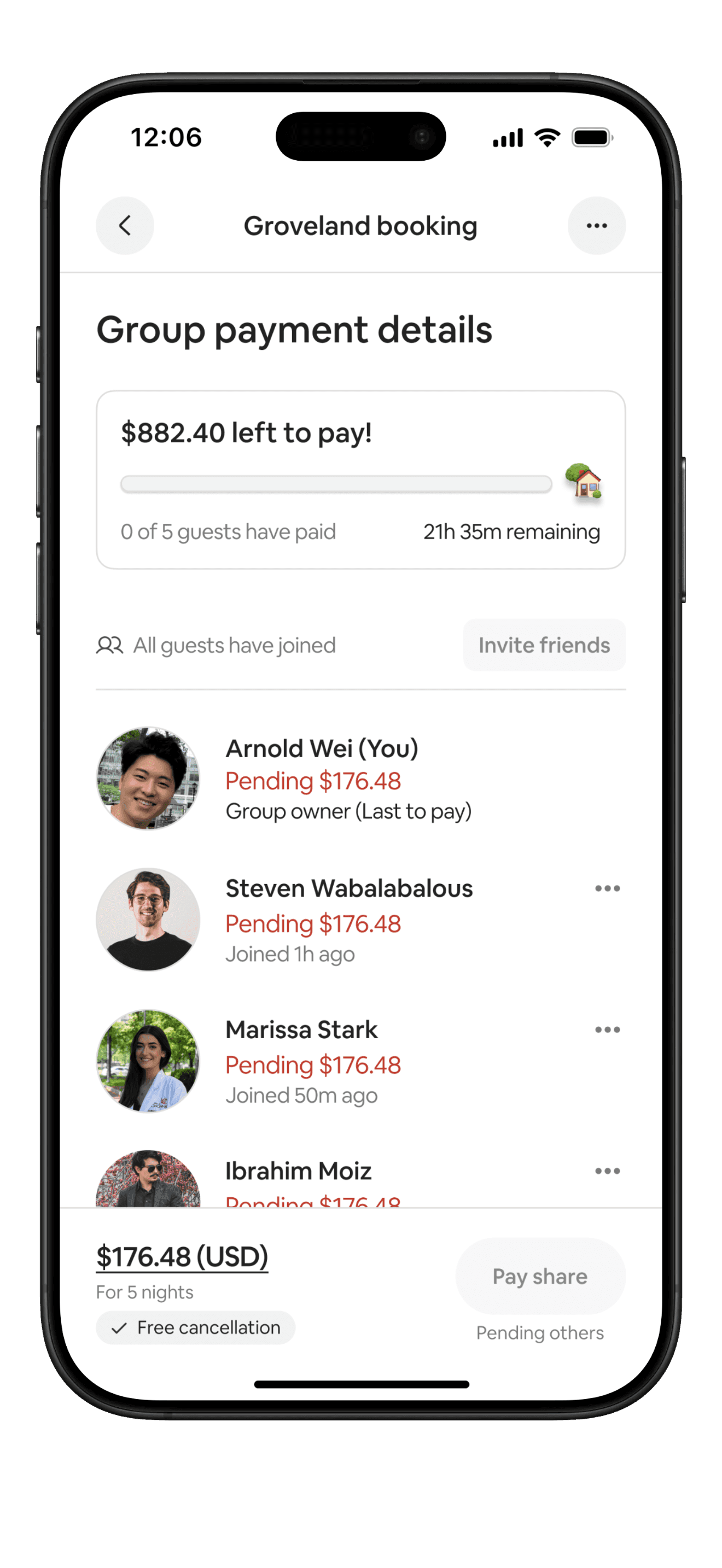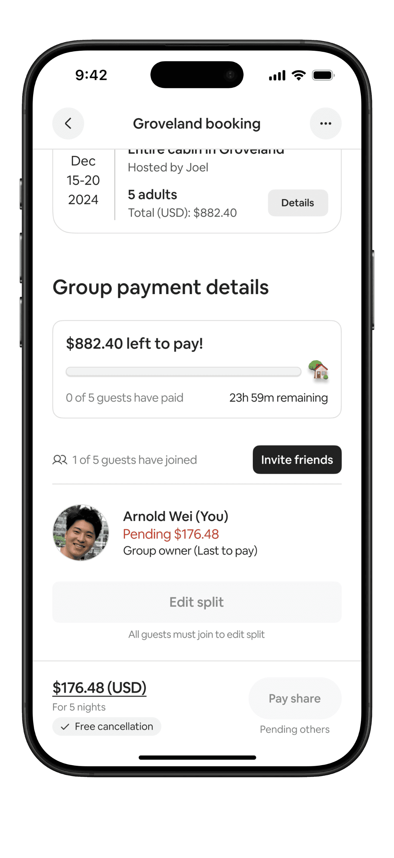 The user who creates the booking becomes the designated "group owner" and has the exclusive ability to invite guests, edit splits, and contact the host. This prevents version control issues and mimics real-life group dynamics we observed through research.
