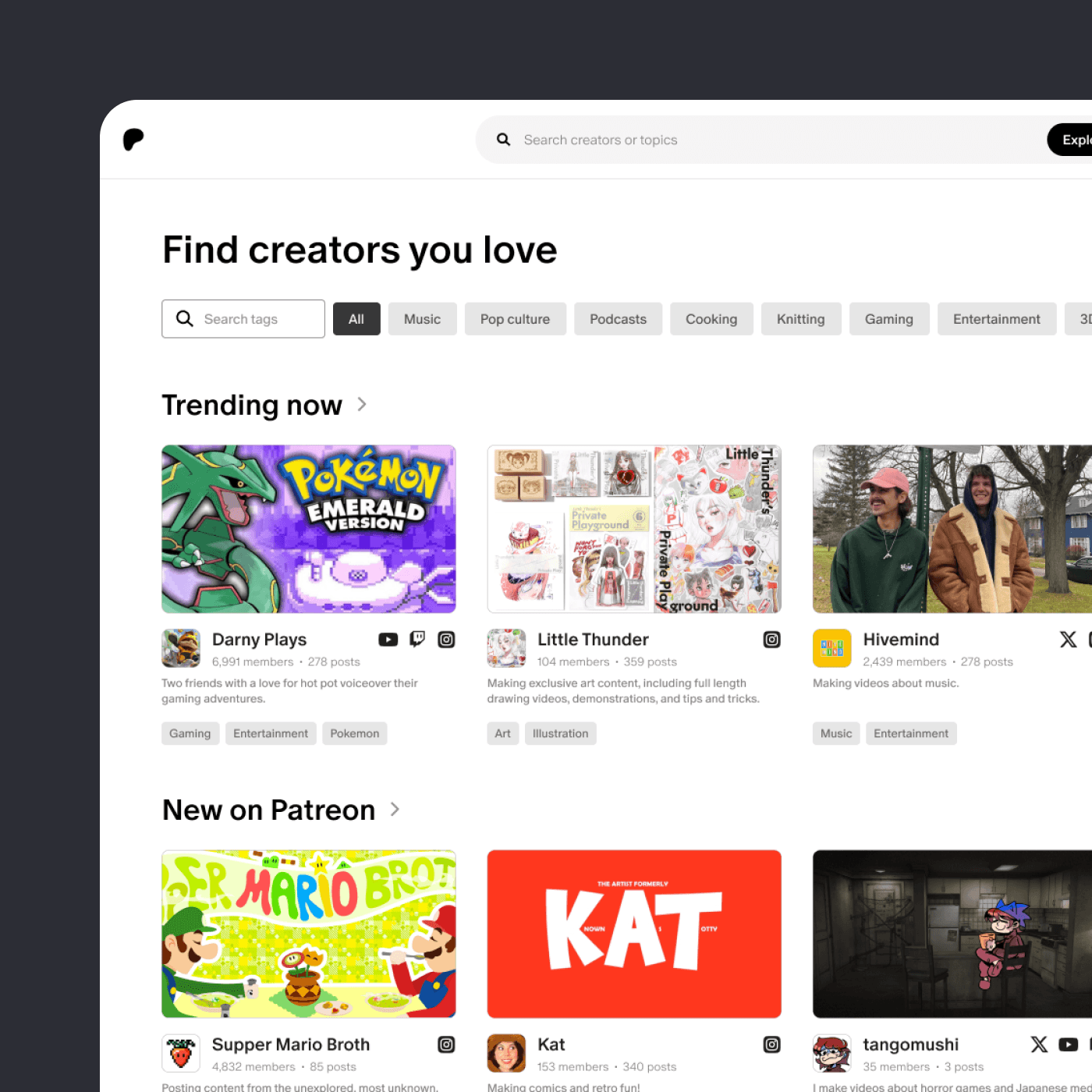 During my design bootcamp, my partner and I were tasked to reimagine Patreon's explore feature to better connect users with creators they'd love.